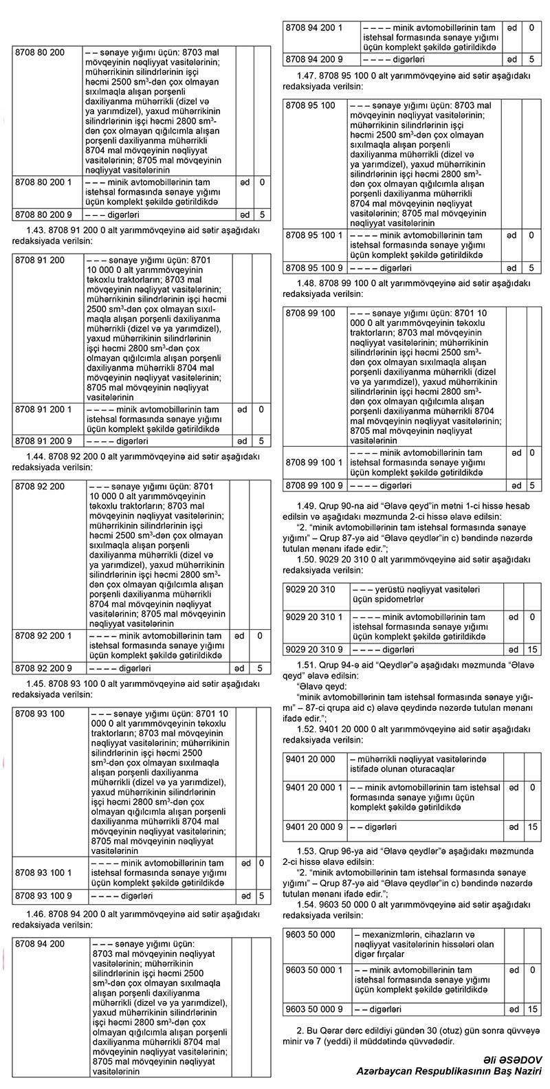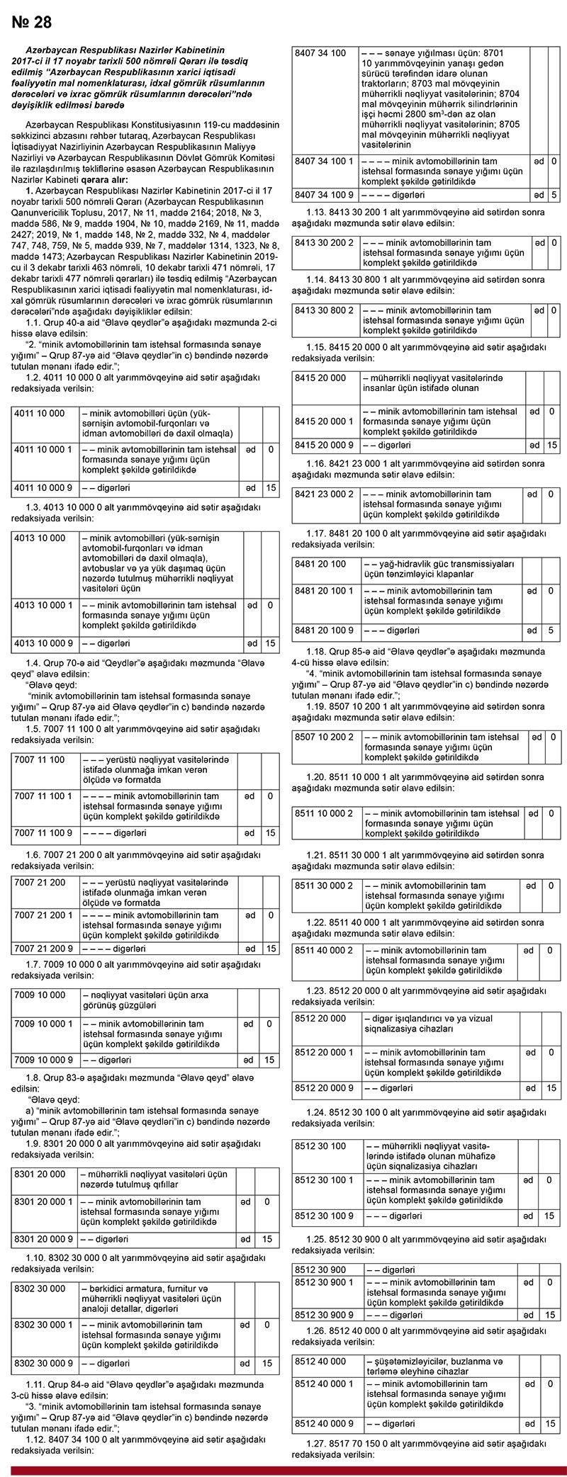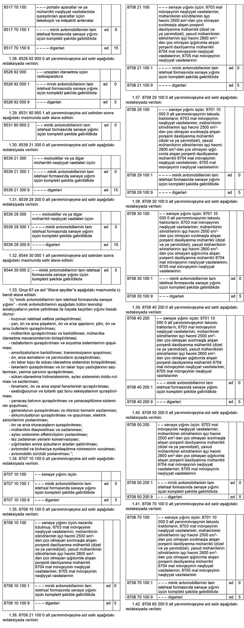 Nazirlər Kabineti bununla bağlı “Azərbaycan Respublikasının xarici iqtisadi fəaliyyətin mal nomenklaturası, idxal gömrük rüsumlarının dərəcələri və ixrac gömrük rüsumlarının dərəcələri”ndə dəyişiklik edib.