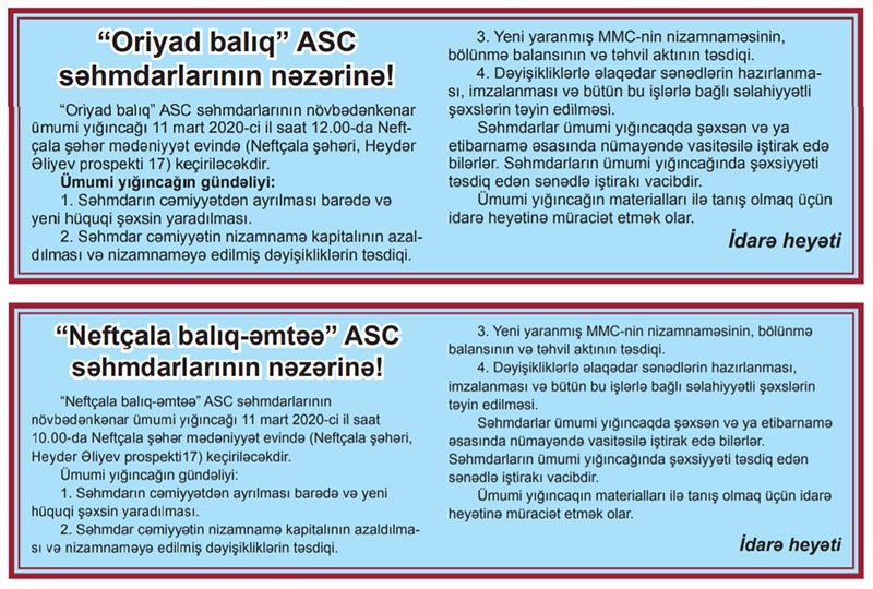 9 dekabr 2019-cu il tarixində Neftçala şəhər mədəniyyət evində “Oriyad balıq” ASC və “Neftçala balıq-əmtəə” ASC səhmdarlarının ümumi yığıncağı keçiriləcəyi bildirilmişdi. Hər iki cəmiyyətinin yığıncağının gündəliyinə -Nizamnamənin yeni redaksiyada qəbul edilməsi, ASC-nin nəzarət və idarə orqanlarının formalaşdırılması, Dəyişikliklərin dövlət qeydiyyatına alınması üçün səlahiyyətli şəxslərin müəyyən edilməsi və Cari məsələlərin müzakirəsi daxil idi.
