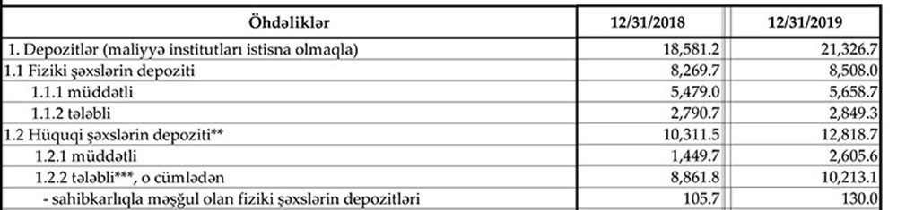 Hüquqi şəxslərin müddətli depozitləri 1 milyard 156 milyon manat artaraq 2 milyard 606 milyon manata, tələbli depozitləri isə 1 milyard 351 milyon manat artaraq 10 milyard 213 milyon manata yüksəlib.