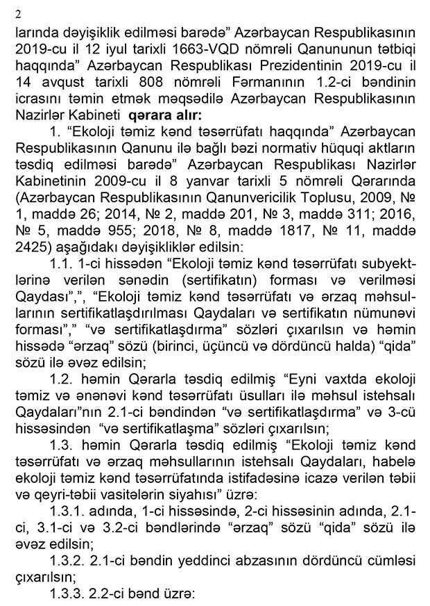 Qərarda həmçinin “Ekoloji təmiz kənd təsərrüfatı haqqında” qanuna da dəyişiklik nəzərdə tutulur. Dəyişikliklərə əsasən, ekoloji təmiz qida məhsulları istehsal etmək niyyətində olan şirkətlər bunun üçün quraşdırdıqları avadanlıqlara da müvafiq sertifikatlar almalıdır. Yalnız bu halda həmin şirkətin istehsal etdiyi qida məhsulu ekoloji təmiz məhsul kimi satışa çıxarıla bilər.