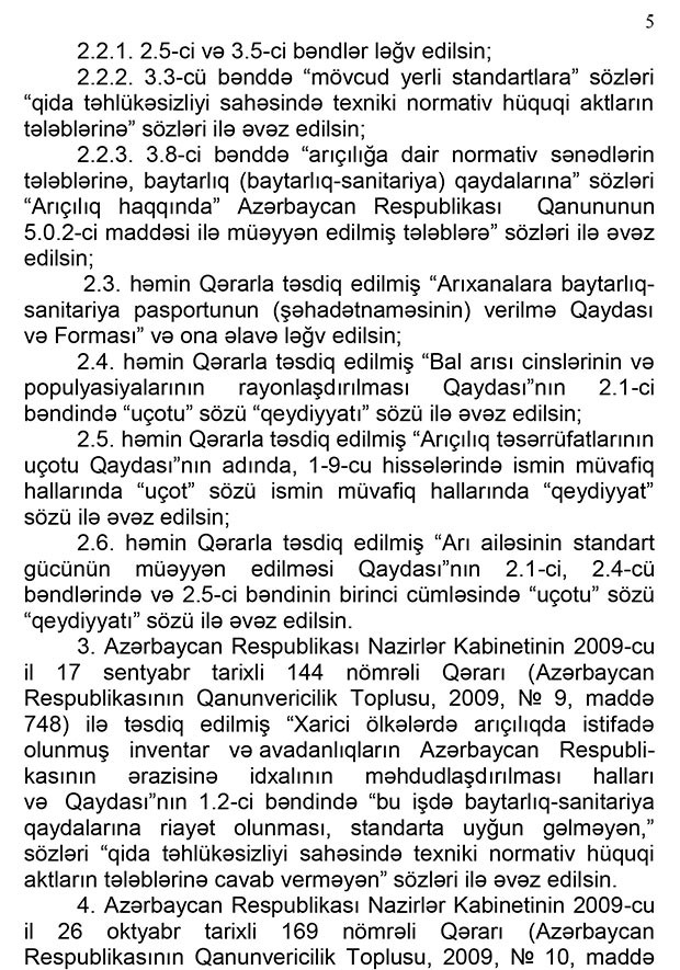 Qərarda “Arıçılıq haqqında” qanuna edilmiş dəyişiklik isə arıçılıq məhsullarının istehsalı zamanı istifadə olunan avadanlıq və vasitələrin ekoloji təmiz standartlara uyğunluğu üçün sertifikat və baytarlıq şəhadətnaməsi alınmasını nəzərdə tutur. Yəni qərar arıçılıq sahəsində baytarlıq nəzarətini də tənzimləyəcək. Qərar arıçılıq məhsullarının gigiyenik standartlara uyğunluğuna dair normativləri də müəyyənləşdirir.
