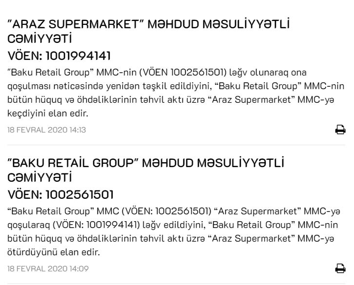Bu gün "Baku Retail Group” MMC “Araz Supermarket” MMC-yə qoşularaq ləğv edildiyini açıqlayıb.