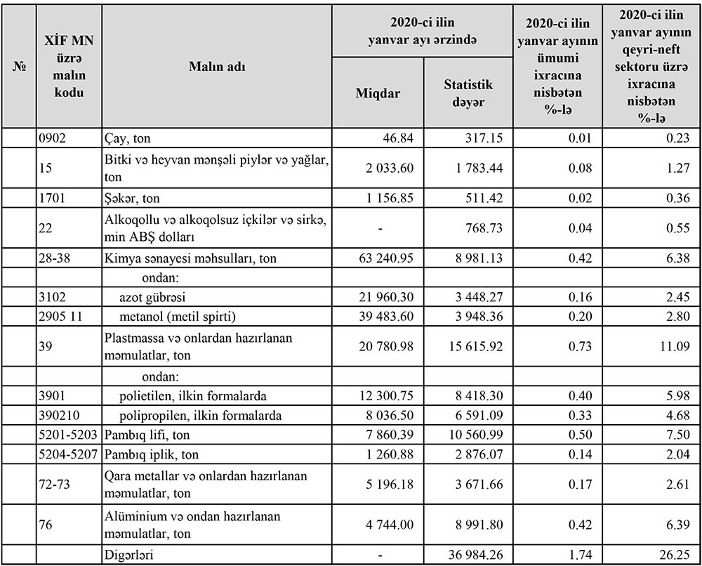 2020-ci ilin Yanvar ayı ərzində Azərbaycanın ən çox ixrac və idxal etdiyi mallar.
