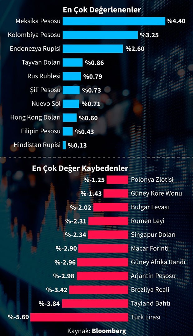 TL-nin ardınca 3,8% ucuzlaşma ilə Tayland Bahtı, 3,42% ucuzlaşma ilə Braziliya Realı, 2,98% ucuzlaşma ilə Argentina Pesosu, 2,96% ucuzlaşma ilə Cənubi Afrika Randı gəlir.