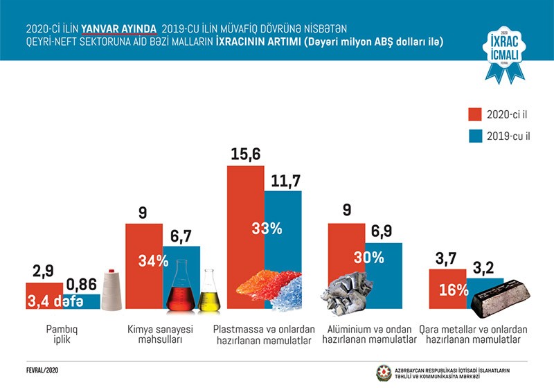 2019-cu illə müqayisədə 2020-ci ilin yanvar ayında pambıq ipliyinin ixracı 3.4 dəfə, kimya sənayesi məhsullarının ixracı 34 faiz, plastmassa və onlardan hazırlanan məmulatların ixracı 33 faiz, alüminium və ondan hazırlanan məmulatların ixracı 30 faiz, qara metallar və onlardan hazırlanan məmulatların ixracı 16 faiz artıb.