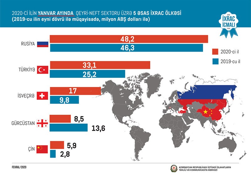 2020-ci ilin yanvar ayında Rusiyaya 48,2 milyon, Türkiyəyə 33,1 milyon, İsveçrəyə 17 milyon, Gürcüstana 8,5 milyon və Çinə 5,9 milyon ABŞ dolları dəyərində qeyri-neft sektoruna aid mal ixrac olunub.
