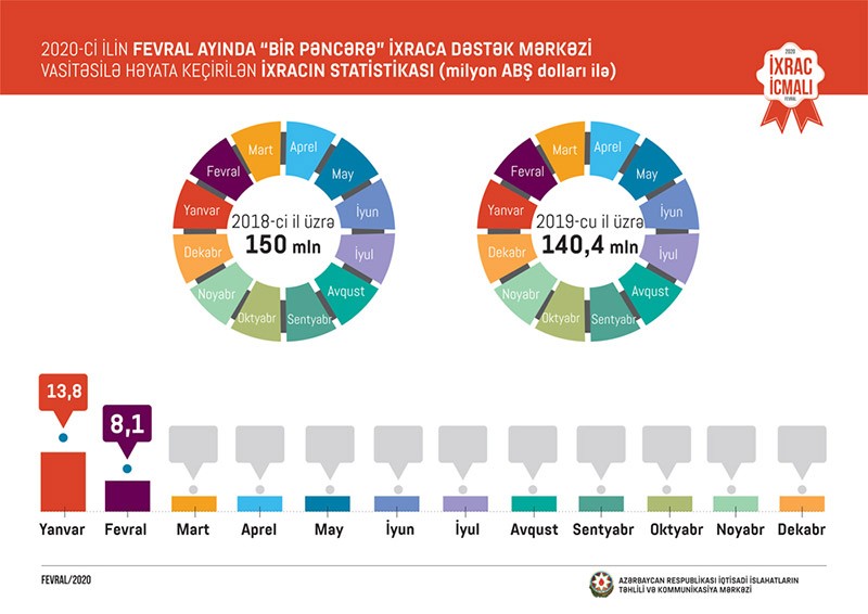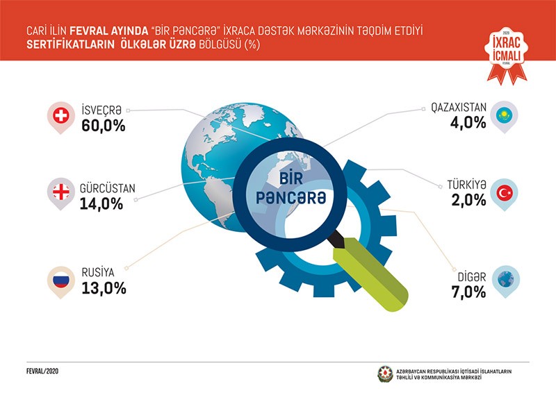 “Bir Pəncərə” İxraca Dəstək Mərkəzinin sertifikat təqdim etdiyi məhsullar 21 ölkəyə- İsveçrə (60%), Gürcüstan (14%), Rusiya (13%), Qazaxıstan (4%), Türkiyə (2%), Birləşmiş Krallıq (2%), digər ölkələrə (5%)- (Ukrayna, Çexiya, Belçika, Belarus, İspaniya, Niderland, Malayziya, Avstraliya, Çin, Oman, İsrail, Almaniya, İraq, Səudiyyə Ərəbistanı) ixrac edilib. İxrac statistikasına nəzər yetirdikdə 2019-cu ilin fevral ayı ilə müqayisədə ixracda 2,2 milyon ABŞ dolları dəyərində artım müşahidə olunub.