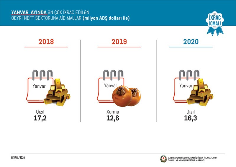 2020-ci ilin yanvar ayı ərzində ixrac edilən qeyri-neft sektoruna aid malların siyahısına qızıl (sikkə kəsilməsində istifadə olunmayan, digər emal olunmamış formalarda – 16,3 milyon ABŞ dolları) başçılıq edib. Bu siyahıda pomidor (13,2 milyon ABŞ dolları) ikinci və qabığı təmizlənmiş meşə fındığı (11,2 milyon ABŞ dolları) üçüncü olub.