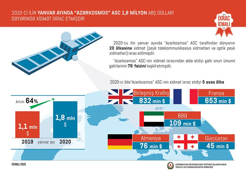 “İxrac İcmalı”nda həm də xidmət ixracının statistik rəqəmləri göstərilib. 2020-cu ilin yanvar ayında “Azərkosmos” ASC tərəfindən dünyanın 20 ölkəsinə 1,8 milyon ABŞ dolları dəyərində xidmət (peyk telekommunikasiya xidmətləri və optik peyk xidmətləri) ixrac edilib. “Azərkosmos” ASC-nin xidmət ixracından əldə etdiyi gəlir onun ümumi gəlirlərinin 79 faizini təşkil edib.