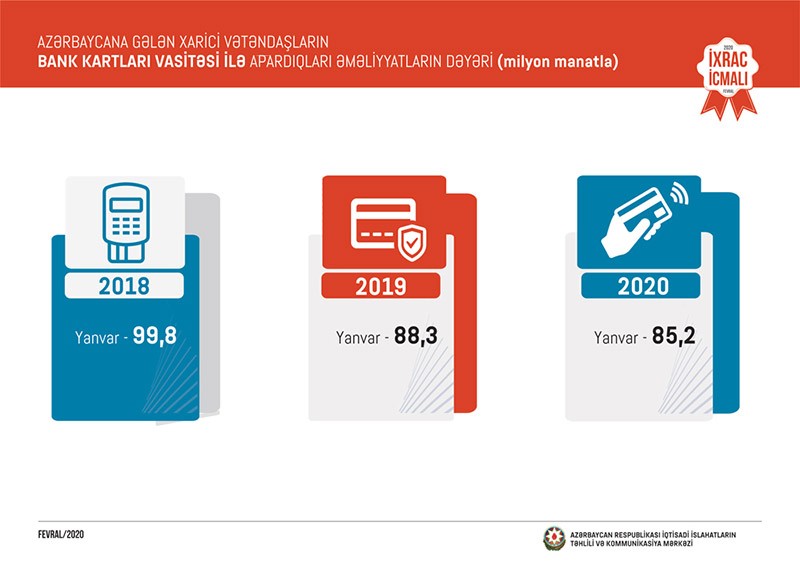 2020-ci ilin yanvar ayında ölkəmizə gələn xarici vətəndaşların bank kartları vasitəsi ilə apardıqları əməliyyatların həcmi 85,2 milyon manat təşkil edib.
