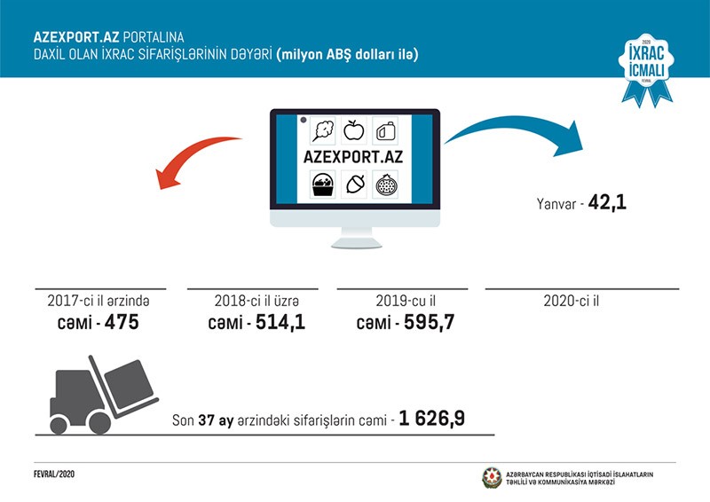 Məlumat üçün qeyd edək ki, 2017-ci ilin yanvar ayından 2020-ci ilin 31 yanvar tarixinə kimi (37 ay ərzində) Azexport.az portalına dünyanın 141 ölkəsindən daxil olan ixrac sifarişlərinin dəyəri 1 milyard 626,9 milyon ABŞ dolları təşkil edib.