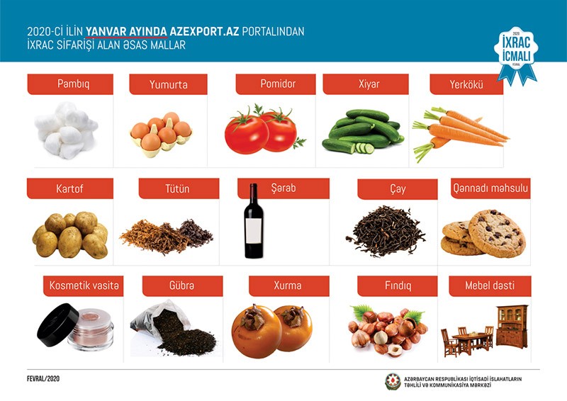 Cari ilin yanvar ayında Azexport.az portalına ən çox ixrac sifarişi pambıq, yumurta, pomidor, xiyar, yerkökü, kartof, tütün, şərab, çay, qənnadı məhsulu, kosmetik vasitə, gübrə, xurma, fındıq, mebel dəsti, tikinti materialı, nar şirəsi və s. mallara daxil olub.