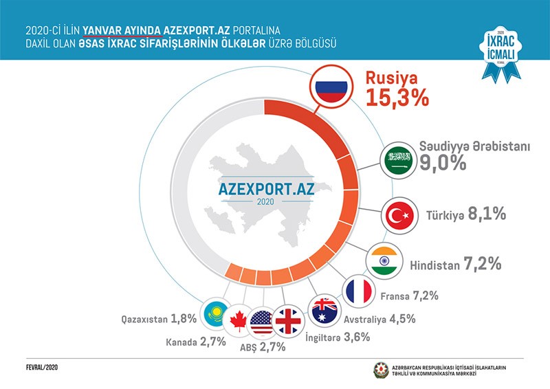 “İxrac İcmalı”nda göstərilib ki, Azexport.az portalına 2020-ci ilin yanvar ayında 42,1 milyon ABŞ dolları məbləğində ixrac sifarişi daxil olub. 2020-ci ilin yanvar ayı ərzində portala daxil olan ixrac sifarişlərinin ilk beşliyində Rusiya (15,3%), Səudiyyə Ərəbistanı (9%), Türkiyə (8,1%), Hindistan (7,2%) və Fransa (7,2%) qərarlaşıb.