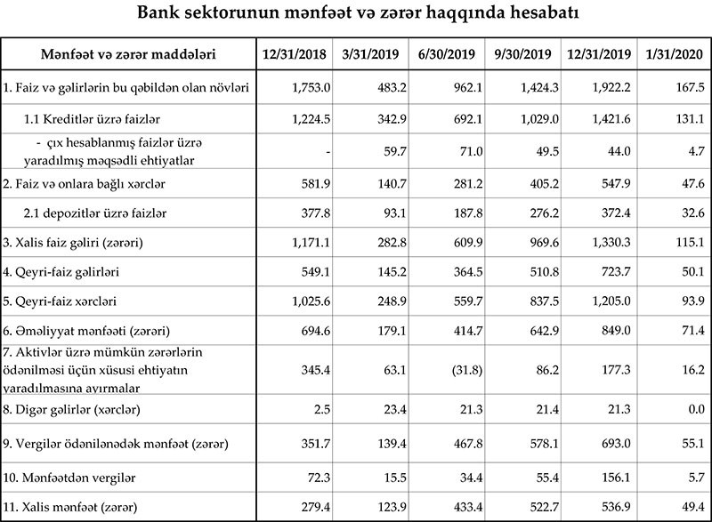 Azərbaycan Mərkəzi Bankı 31 yanvar 2020-ci il tarixinə olan bank sektorunun əsas göstəriciləri açıqlayıb.
