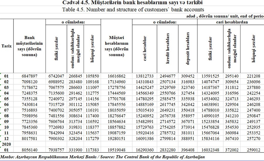 Ötən ilin Yanvar ayı ilə müqayisədə cari hesabların sayı 2 milyon 477 min 627, o cümlədən fiziki şəxslərin cari hesablarının sayı 2 milyon 440 min 823, hüquqi şəxslərin cari hesablarının sayı isə 37 min 804 artıb. Yanvarın sonunda fiziki şəxslərin cari hesablarının sayı 16 milyon 32 min 348, hüquqi şəxslərin cari hesablarının sayı isə 259 min 12 təşkil edib. Təkcə yanvarda hüquqi şəxslərin hesablarının sayı 1742 artıb.