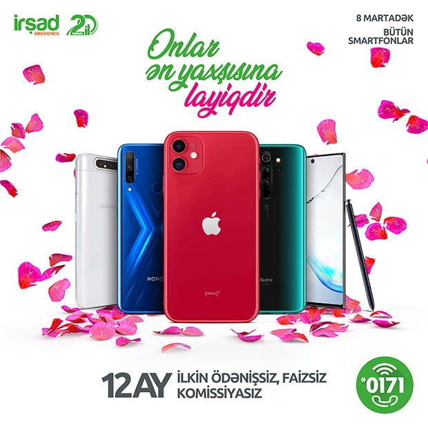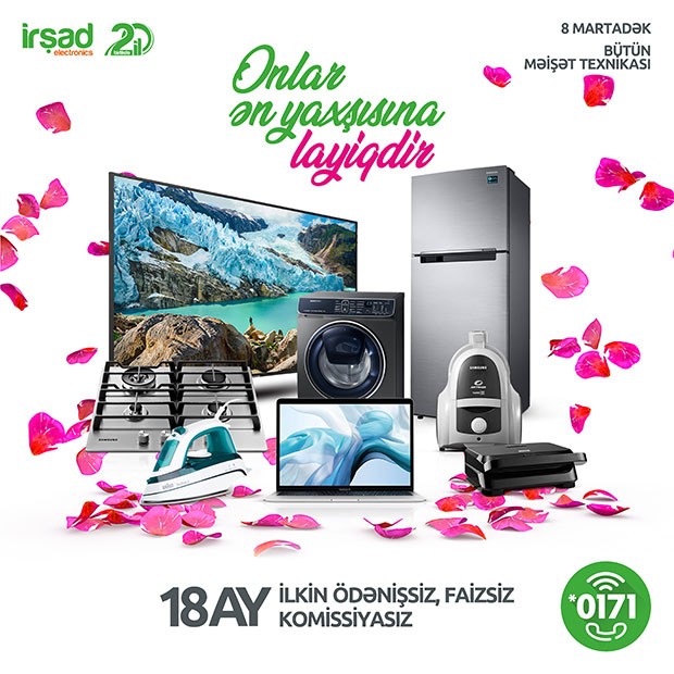 İrşad Elektronics deyir ki, martın 8-dək istədiyiniz məişət texnikasını ilkin ödənişsiz, faizsiz və komissiyasız olaraq, 18 aya hissə-hissə ödəmə şərti ilə ala bilərsiniz. Hətta nağd almaq istəsəniz, sizə 40 faizədək endirim təklif olunacaq. Onlar ən yaxşısına layiqdirlər, Siz də ən yaxşısını onlar üçün seçin!
