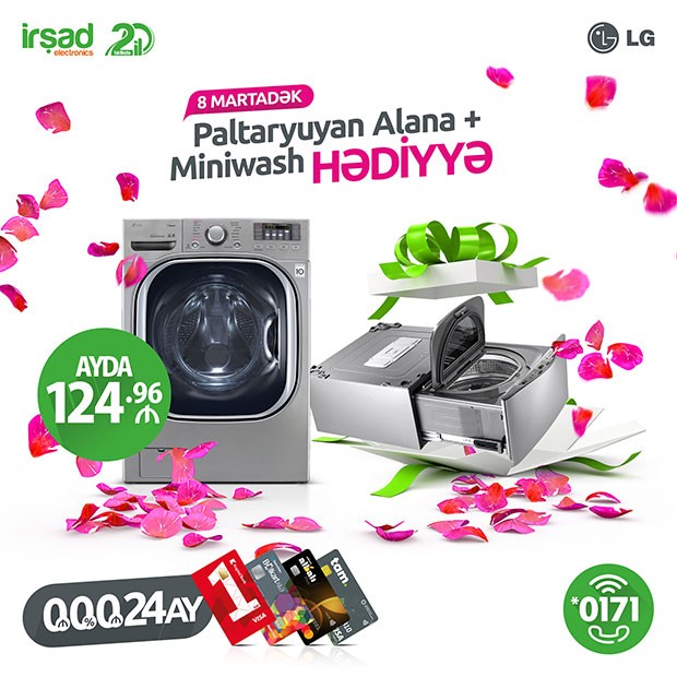 Yaxud da LG paltaryuyan maşını almaq istəsəniz, siz çox praktik və rahat mini-wash hədiyyə əldə edəcəksiniz. Əl altında, tez-tələsik yuyulması istənilən əşyalar üçün ideal olan mini-wash texnoloji yeniliklərdən olduğundan, çox az qadının aldığı hədiyyələr sırasındadır! İlkin ödənişsiz, faizsiz, 24 ay hissə-hissə ödəmə şərtilə bu yeniliyi sevdiyinizə tanıdın!