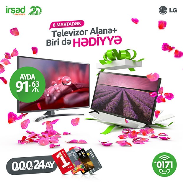 Ya da ona televizor alın, sizin futbol matçlarınızda pult üstündə xətrinə dəyməyəsiniz! BirKart-la İrşad Elektronics-dən bir LG televizoru alsanız, ikincisi sizə hədiyyə veriləcək. İlkin ödənişsiz, faizsiz, 24 ay ərzində ayda 91 manat 63 qəpik ödəməklə siz ona sevdiyi serialı rahat izləmək imkanı hədiyyə edə bilərsiniz.