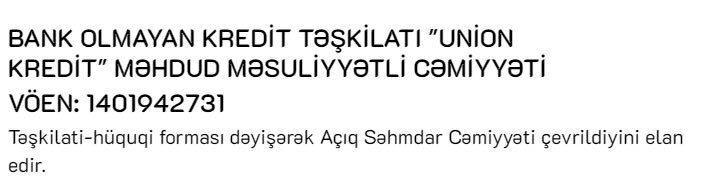 Bank Olmayan Kredit Təşkilatı (BOKT) “Union Kredit” MMC təşkilati-hüquqi formasını dəyişərək ASC-yə çevrildiyini elan edib.