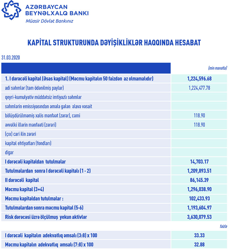31 Mart 2020-ci il tarixində Azərbaycan Beynəlxalq Bankı 1 milyard 296 milyon 38 min manat məcmu kapitala malik olub.