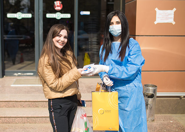 "Günay Sığorta” ASC və "Sağlam Ailə” Tibb Mərkəzinin birgə təşkilatçılığı ilə icra olunan layihə çərçivəsində Bakı və Sumqayıt şəhərlərindən sonra Gəncə və Şəki şəhərlərində də vətəndaşlara dezinfeksiyaedici məhlul, salfet və maarifləndirici materiallar paylanılıb və vətəndaşlara zəruri olmadığı halda evdə çıxmamaqları, Nazirlər Kabineti yanında operativ qərargahın tövsiyələrinə əməl etmələri söylənilib.