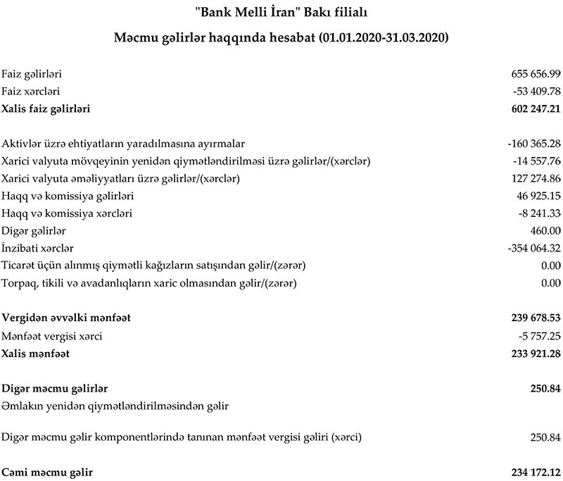 Marja Bankın maliyyə göstəricilərinə istinadən xəbər verir ki, 2020-ci ilin yanvar-mart dövründə "Bank Melli İran" Bakı filialının cəmi gəlirləri 830 min 565 manat, cəmi xərcləri isə 596 min 393 manat təşkil edib. Gəlirlər xərcləri üstələdiyindən filialın 234 min 172 manat xalis mənfəəti yaranıb.