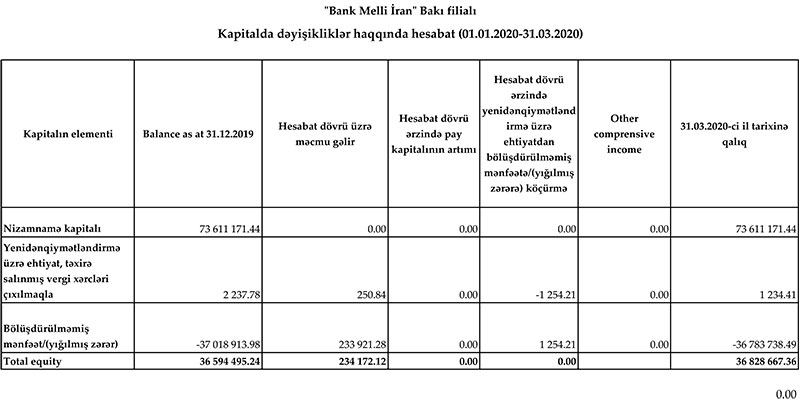 31 Mart 2020-ci il tarixində "Bank Melli İran" Bakı filialı 36 milyon 828 min manat məcmu kapitala malik olub.