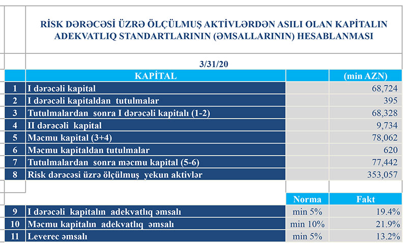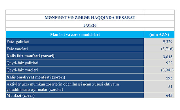Müqayisə üçün qeyd edək ki, 2019-cu ilin yanvar-mart dövründə “TuranBank”ın cəmi gəlirləri 8 milyon 650 min manat, cəmi xərcləri isə 9 milyon 93 min manat təşkil edtmişdi. Xərclər gəlirləri üstələdiyindən Bankın 444 min manat əməliyyat zərəri yaranmışdı. Lakin ehtimal olunan depozit və kredit itkiləri üçün yaradılmış ehtiyatdan 553 min manatın azad olması hesabına həm əməliyyat zərəri bağlanmış, həm də Bankın 109 min manat xalis mənfəəti yaranmışdı.