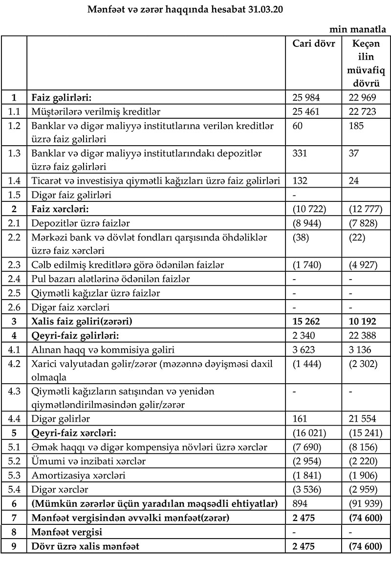 “AccessBank” QSC 2020-ci ilin 1-ci rübünü 2 milyon 475 min manat xalis mənfəət ilə başa vurub. Halbuki, Bank ötən ilin ilk rübünü 74 milyon 600 min manat zərər ilə bağlamışdı.