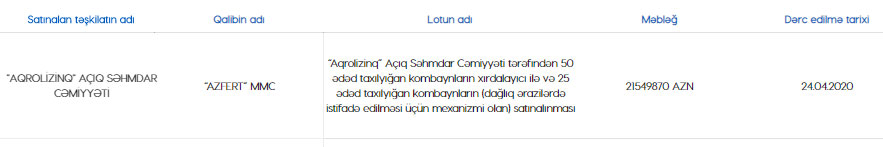 “Aqrolizinq” Açıq Səhmdar Cəmiyyəti tərəfindən 50 ədəd taxılyığan kombaynların xırdalayıcı ilə və 25 ədəd taxılyığan kombaynların (dağlıq ərazilərdə istifadə edilməsi üçün mexanizmi olan) satınalınması üçün elan edilmiş tenderin qalibi məlum olub: “AZFERT”