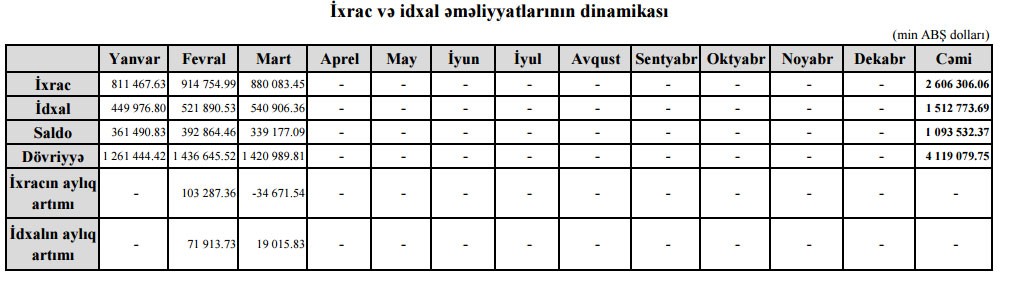 Mart ayında ixrac 880 milyon dollar, idxal isə 540 milyon 906 min dollar təşkil edib. Yanvarda idxal 449 milyon 976 min dollar, Fevralda isə 521 milyon 890 min dollar təşkil etmişdi. Güründüuyü kimi aydan-aya idxalın məbləği artır.
