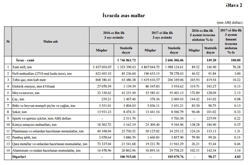 2017-ci ilin ilk 3 ayı ərzində Azərbaycandan 1 milyard 988 milyon dollarlıq xam neft ixrac olunub.