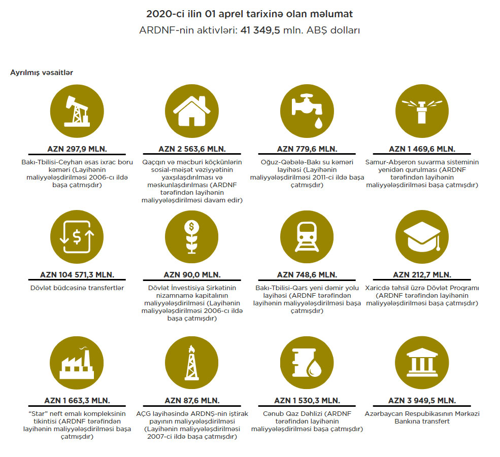 2003-cü ildən 2020-ci il aprelin 1-dək Azərbaycan Dövlət Neft Fondundan (ARDNF) dövlət büdcəsinə transfertlərin ümumi həcmi 104 milyard 571,3 milyon manat təşkil edib. Bu barədə onddan məlumat verilib.