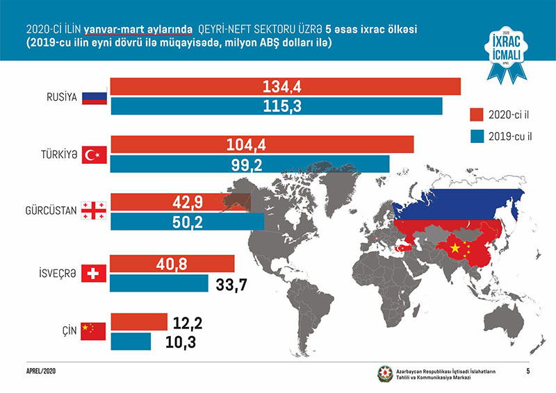 2019-cu ilin müvafiq dövrü ilə müqayisədə 2020-cu ilin birinci rübündə Rusiyaya qeyri-neft ixracı 16,6 faiz, Türkiyəyə 5,2 faiz, İsveçrəyə 21,1 faiz və Çinə 18,4 faiz artıb.