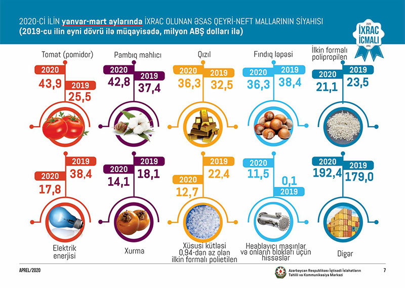 2020-ci ilin yanvar-mart ayları ərzində ixrac edilən qeyri-neft sektoruna aid malların siyahısında isə pomidor (43,9 milyon ABŞ dolları) birinci, pambıq mahlıcı (42,8 milyon ABŞ dolları) ikinci və qızıl (sikkə kəsilməsində istifadə olunmayan, digər emal olunmamış formalarda – 36,3 milyon ABŞ dolları)üçüncü olub.