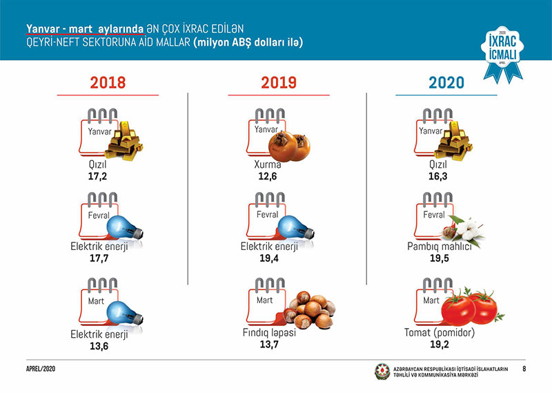 2020-ci ilin mart ayında isə qeyri-neft sektoru üzrə ixrac 133 milyon ABŞ dolları təşkil edib. Bu ilin mart ayında qeyri neft-qaz məhsulları ən çox mal Rusiyaya (46,4 milyon ABŞ dolları), Türkiyəyə (29 milyon ABŞ dolları), İsveçrəyə (12 milyon ABŞ dolları), Gürcüstana (8 milyon ABŞ dolları) və Ukraynaya (6,2 milyon ABŞ dolları) ixrac edilib.
