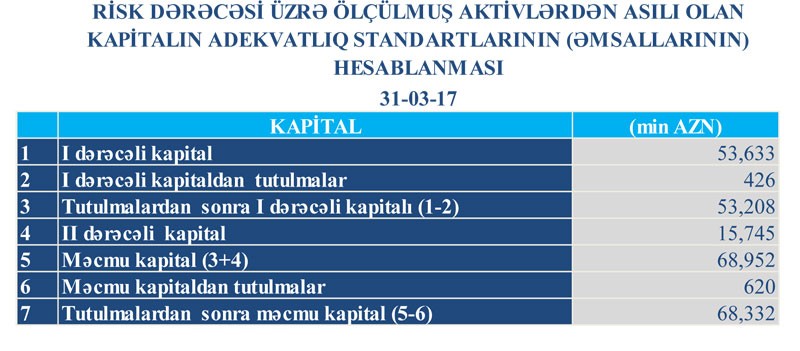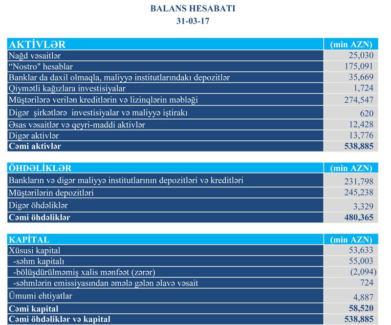 31 Mart 2017-ci il tarixinə TuranBank 538 milyon 885 min manat cəmi aktivlərə, 480 milyon 365 min manat cəmi öhdəliklərə, 58 milyon 520 min manat cəmi kapitala malik olub.