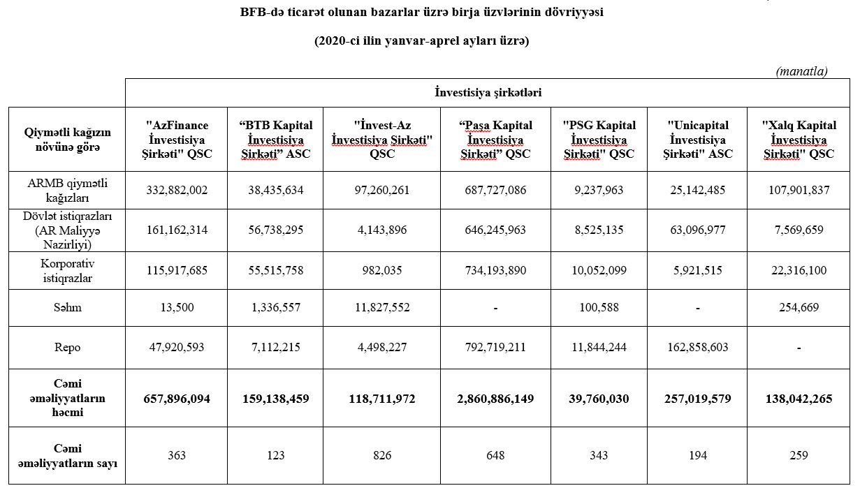 “Marja” Bakı Fond Birjasına istinadən xəbər verir ki, 2 milyard 860 milyon 886 min manat manat dövriyyə ilə “PAŞA Kapital İnvestisiya Şirkəti” 1-ci, 657 milyon 896 min manat dövriyyə ilə "AzFinance İnvestisiya Şirkəti" 2-ci, 257 milyon 19 min manat dövriyyə ilə "Unicapital İnvestisiya Şirkəti" 3-cü, 159 milyon 138 min manat dövriyyə ilə “BTB Kapital İnvestisiya Şirkəti” 4-cü və 118 milyon 711 min manat dövriyyə ilə "İnvest-Az İnvestisiya Şirkəti" 4-cü yeri tutub.