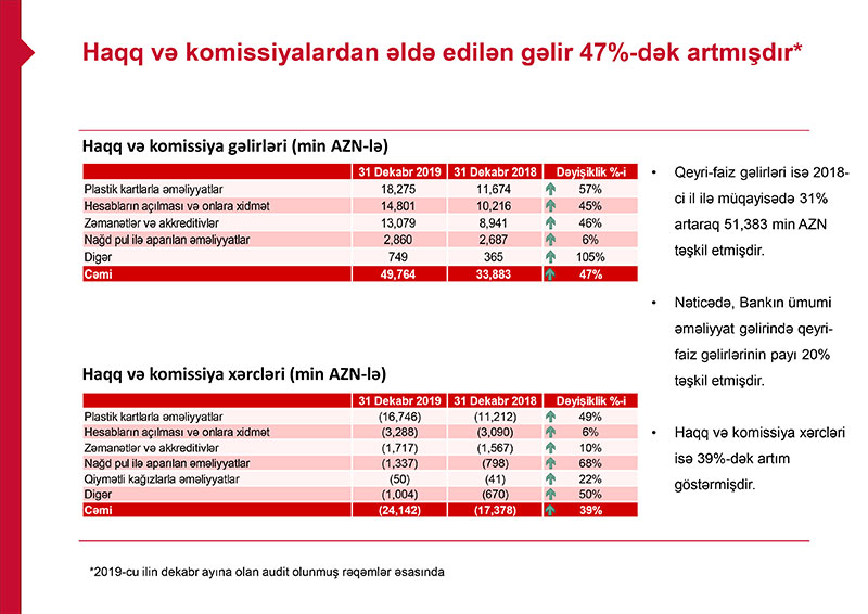 Marja Bankın 31 dekabr 2019-cu il tarixinə bitən il üzrə özünün və törəmə banklarının maliyyə nəticələrinə istinadən xəbər verir ki, PAŞA Bank ötən il plastik kartlarla əməliyyatlardan 18 milyon 275 min manat komissiya gəliri əldə edib. Bu, 2018-ci illə müqayisədə 57% çoxdur.