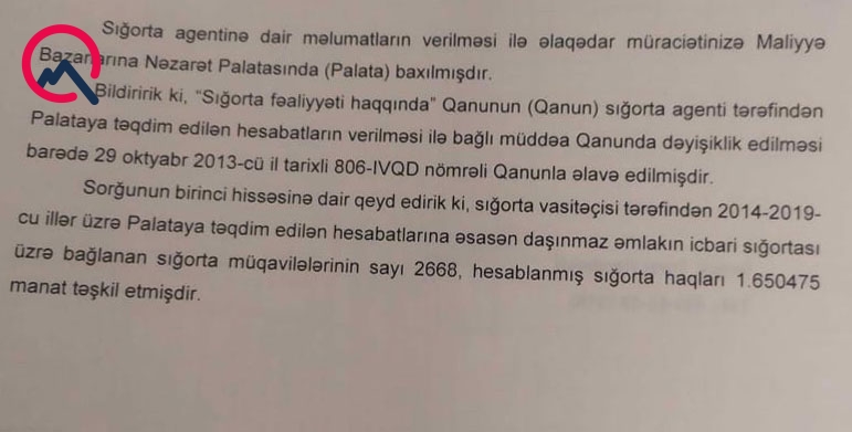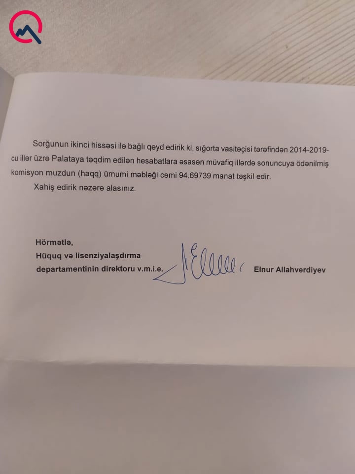R.Əsgərovun sözlərinə görə, Maliyyə Bazarlarına Nəzarət Palatasından onun sorğusuna verilən rəsmi cavabda qeyd olunub ki, onun vasitəçiliyi ilə 2 668 sığorta müqaviləsi bağlanıb, 1 650 475 manat sığorta haqları məbləği toplanıb: “Lakin bunun müqabilində mənə 94 697 manat komission ödənilib. Ödənilən məbləğ də məktubda öz əksini tapıb. Amma bu rəsmi rəqəmlərə əsasən aparılan hesablamadan məlum olur ki, 1,6 milyon manat sığorta haqqının müqavilə şərtləri üzrə 11 faiz komission muzdu 181 553 manat təşkil edir. Lakin sığorta şirkəti tərəfindən bu məbləğin yalnız 94 697 manatı ödənilib. Bununla da “Azsığorta” ASC 86 856 manat məbləğində komissionu məndən gizlədərək ödəməyib”.