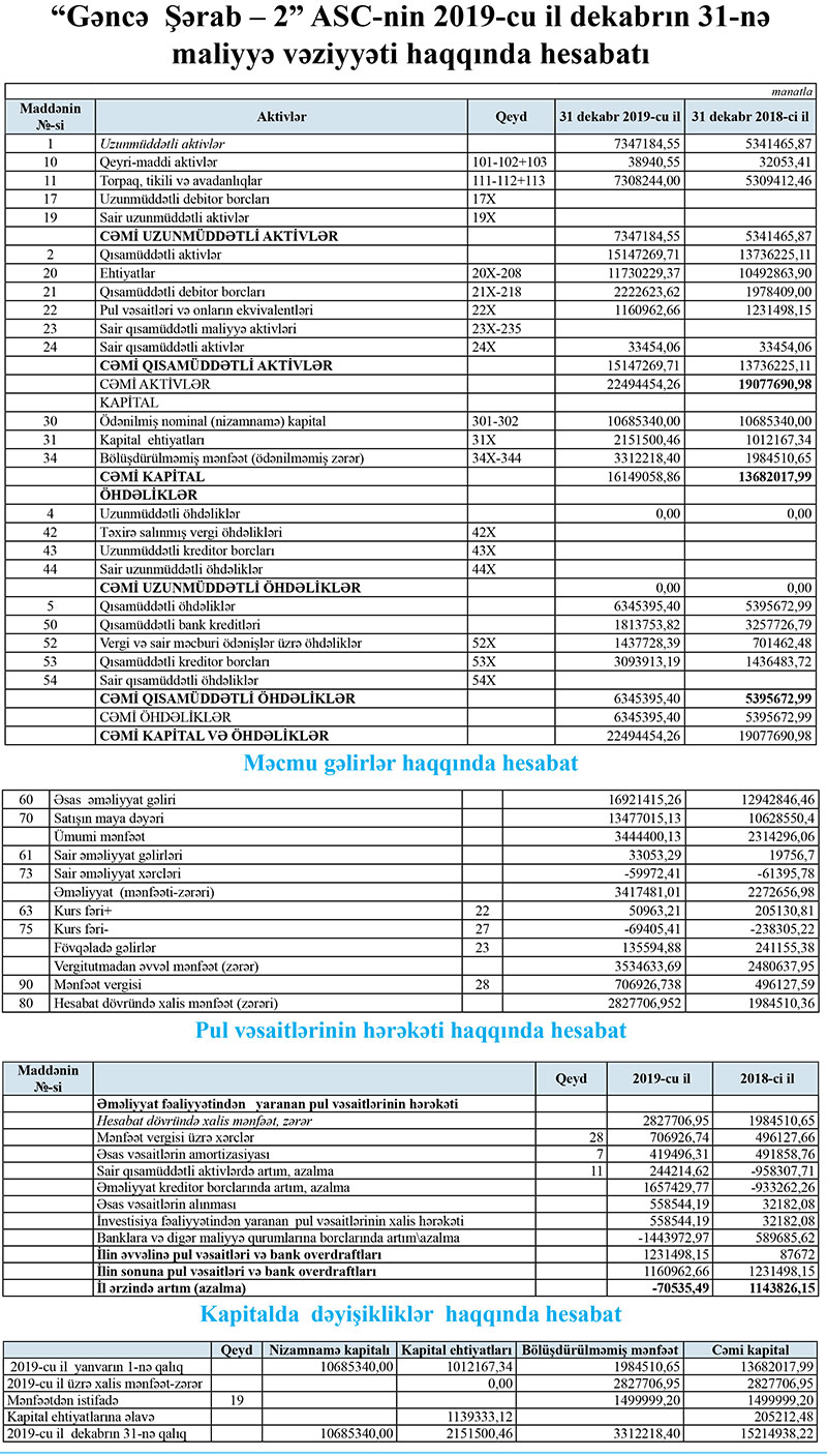 31 Dekabr 2019-cu il tarixində “Gəncə Şərab -2” ASC 10 milyon 685 min manat nizamnamə kapitalına, 16 milyon 149 min manat cəmi kapitala malik olub.