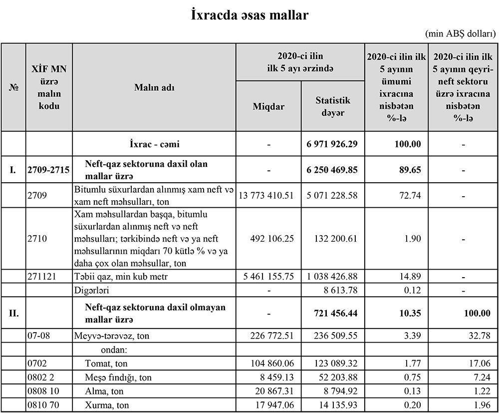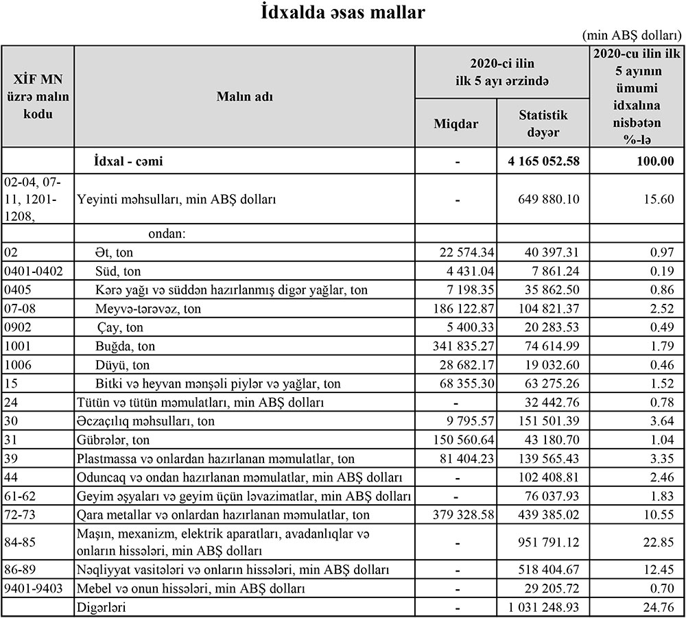 2020-ci ilin yanvar-may ayları ərzində (ilk 5 ayda) Azərbaycanın ən çox ixrac və idxal etdiyi mallar.