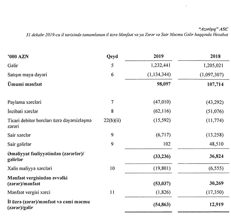 "Azərişıq" ASC 2019-cu ili 54,9 milyon manat xalis zərərlə başa vurub. Halbuki qurum 2018-ci ildən 12,9 milyon manat xalis mənfəətlə çıxmışdı.