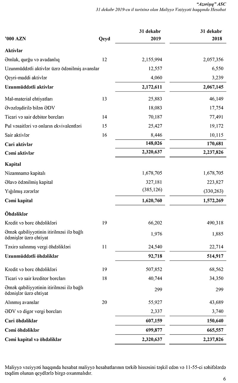 Bu il yanvarın 1-nə "Azərişığ"ın aktivləri 2 milyard 320,6 milyon manat olub ki, bu da illik müqayisədə 3,7% çoxdur. Hesabat dövründə səhmdar cəmiyyətinin öhdəlikləri təxminən 5% artaraq 0,7 milyon manata, balans kapitalı isə 3,1% artaraq 1 milyard 620,8 milyon manata çatıb.