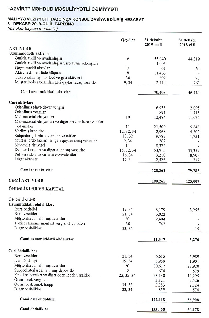 2018-ci illə müqayisədə 2019-cu ildə “Azvirt” MMC-nin cəmi aktivləri 74 milyon 258 min manat və ya 59,4% artaraq 199 milyon 265 min manata yüksəlib.