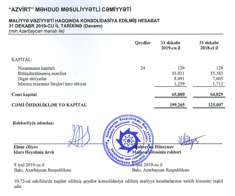 Şirkət 31 Dekabr 2019-cu il tarixində 55 milyon 921 min manat bölüşdürülməmiş mənfəətə malik olub.