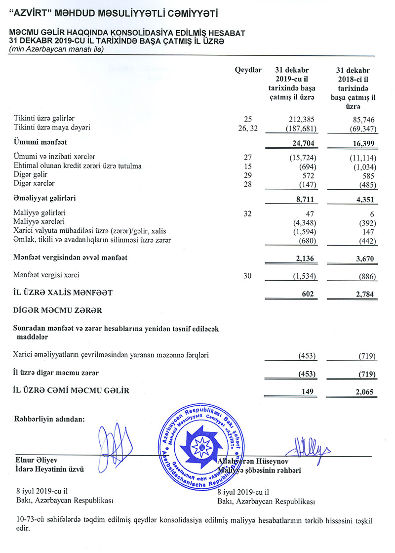 Nəticədə 2018-ci illə müqayisədə ötən il “Azvirt” MMC-nin ümumi mənfəəti (xalis gəlir) 8 milyon 305 min manat və ya 51% araraq 24 milyon 704 min manat təşkil edib (2018-də 16 milyon 399 min manat). Lakin ümumi, inzibati, maliyyə, valyuta və vergi xərclərinin artması mənfəətin azalmasına səbəb olub.