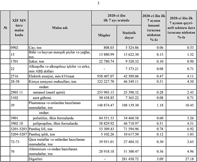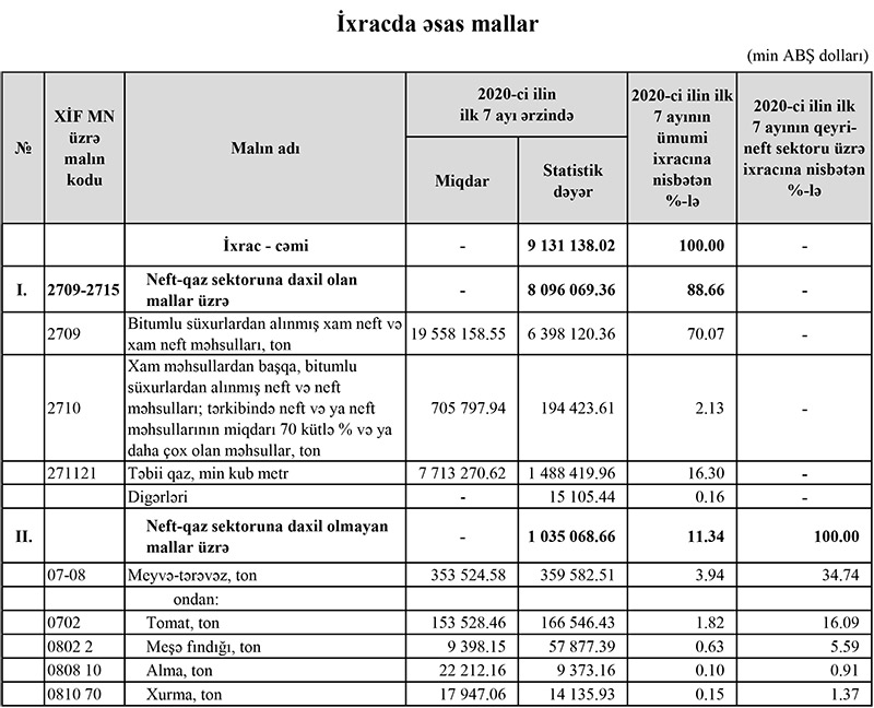 2020-ci ilin ilk 7 ayı ərzində Azərbaycanının cəmi 9 milyard 131 milyon 138 min dollarlıq ixracının 70.07%-ni xam neft, 88.66%-ni isə neft-qaz sektoruna daxil olan mallar formalaşdırıb.