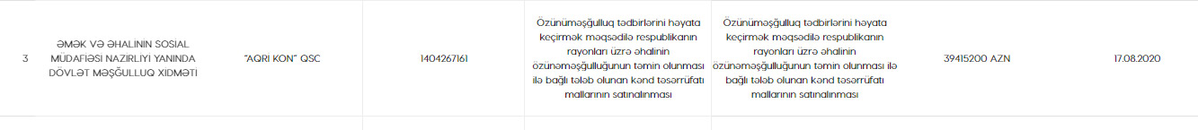 "Aqri Kon" QSC artıq 3-cü dəfədir Dövlət Məşğulluq Xidmətinin elan etdiyi tenderin qalibi olur. Şirkət 2019-cu ildə 2 dəfə qalib olaraq Xidmətdən cəmi 33 milyon 929 min manatlıq sifariş alıb.