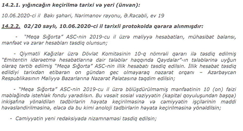 “Meqa Sığorta” ASC-nin 2019-cu il üzrə bölüşdürülməmiş mənfəətinin 10%-i qədər istehlak fondu yaradılıb.